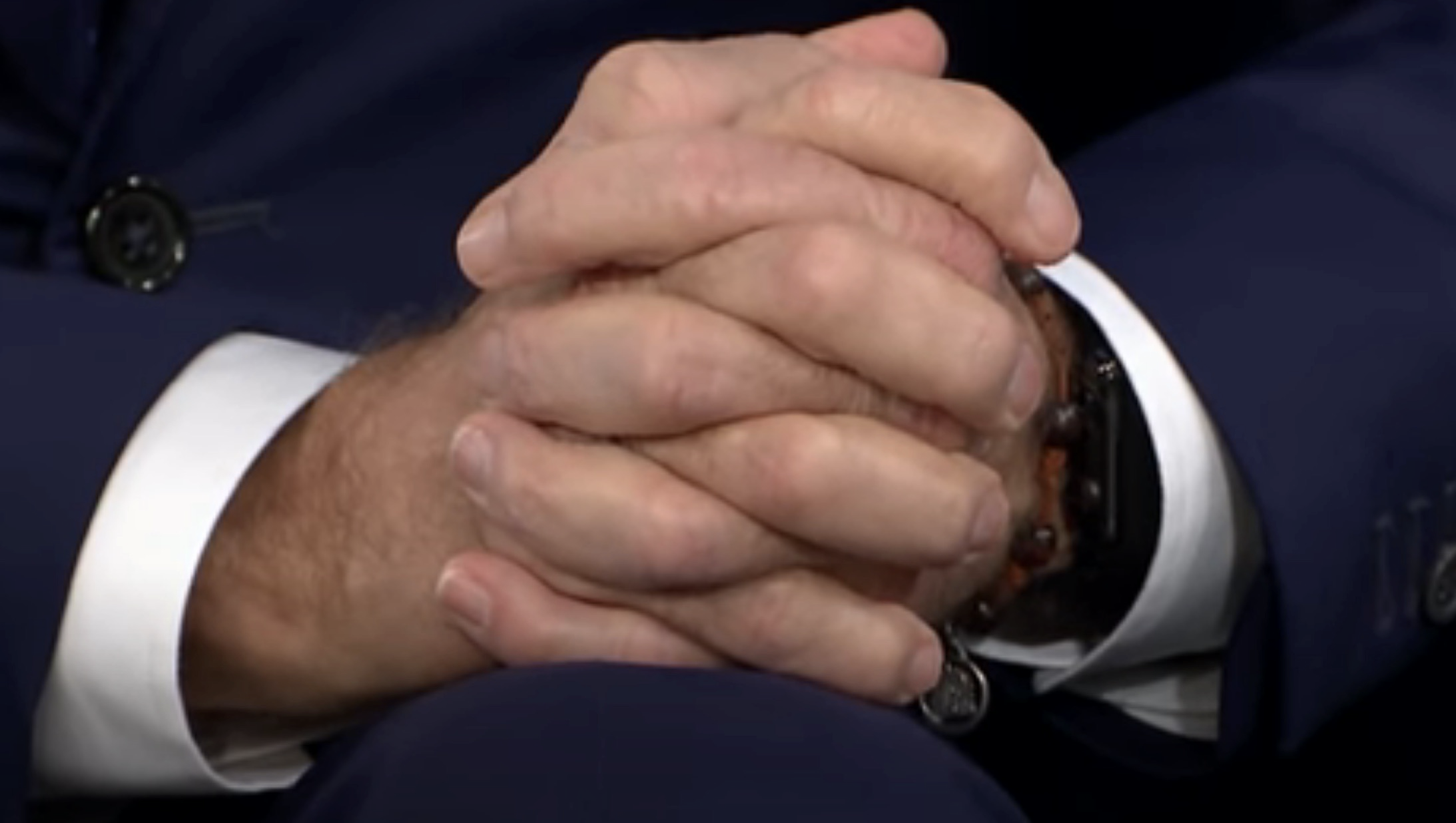 I will say this. I think the thing on his wrist was the rosary bracelet he wears in memory of his son Beau, who died wearing it. I think the wire thing was just a crease in his shirt with the light hitting it just right, perhaps a bit of shadow from the microphone. That said, I have noticed the black dead eyes for some time now and thought it was just him being senile and out of it, but definitely noticed his eyes have looked dead. He always had a twinkle in his eyes, which has been gone for some time. It also makes me wonder about that broken blood vessel he suffered in the one debate.