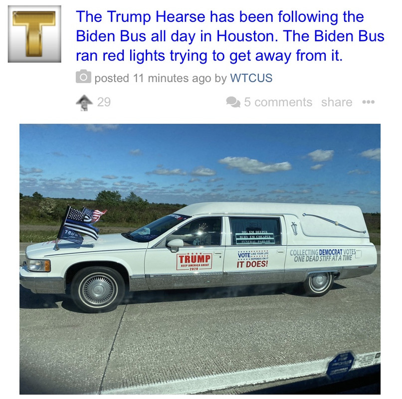 His bus is apparently driving through Texas today and tomorrow if anyone is interested in Flag Waving Trump at the bus — contact your local Republican HQ for times