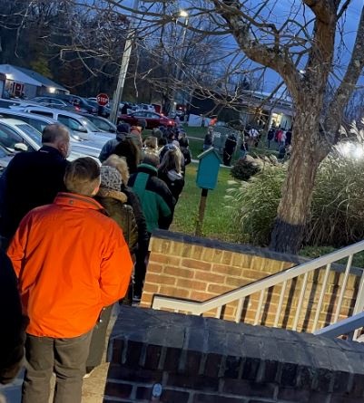 My husband and I left the house at 5:50 to cast our votes for President Trump, Senator Gade, and Rep Good. It was dark, windy and cold, 35°. We stood in line outside for about 6 minutes waiting for the doors to open, then another 5 or so minutes to reach the door. The line in front of us was 35 people or so, and continued to form behind us. Not an overwhelming crowd for a presidential election year, but it was early and this is Charlottesville, after all!