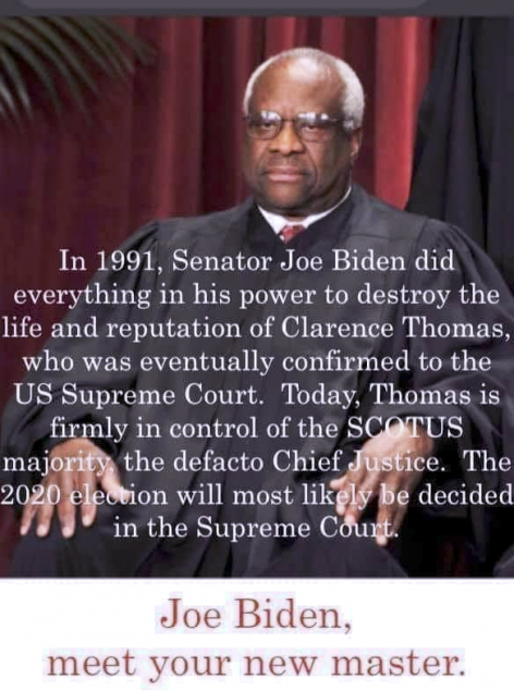 In 1991, Senator Joe Biden did everything in his power to destroy the life and reputation of Clarence Thomas, who was eventually confirmed to the US Supreme Court. Today, Thomas is firmly in control of the SCOTUS majority the defacto Chief Justice. The 2020 election will most likely be decided in the Supreme Court.