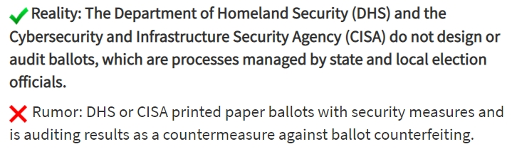 Reality: The Department of Homeland Security (DHS) and the Cybersecurity and Infrastructure Security Agency (CISA) do not design or audit ballots, which are processes managed by state and local election officials.”