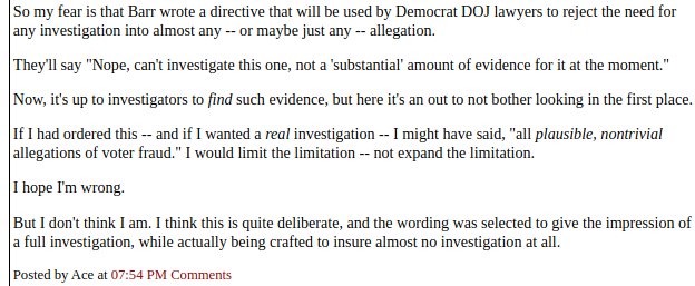 Redstate author and former federal prosecutor, Shipwreckedcrew, has great piece today on this guy and the (his) “procedures.” Pilger is lazy AF and never wanted to investigate anything, yet ALL DoJ election investigations had to be approved by him, hence no investigations. Barr ended that with this memo, authorizing all AUSAs who see cause to investigate, cutting Pilger out, so he quit. That’s good.