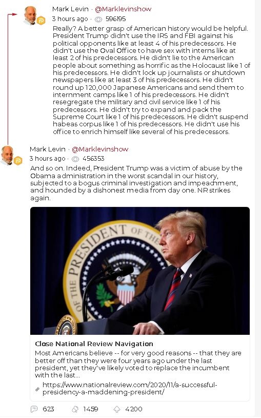President Trump didn’t use the IRS and FBI against his political opponents like at least 4 of his predecessors. He didn’t use the Oval Office to have sex with interns like at least 2 of his predecessors. He didn’t lie to the American people about something as horrific as the Holocaust like 1 of his predecessors. He didn’t lock up journalists or shutdown newspapers like at least 3 of his predecessors. He didn’t round up 120,000 Japanese Americans and send them to internment camps like 1 of his predecessors. He didn’t resegregate the military and civil service like 1 of his predecessors. He didn’t try to expand and pack the Supreme Court like 1 of his predecessors. He didn’t suspend habeas corpus like 1 of his predecessors. He didn’t use his office to enrich himself like several of his predecessors.