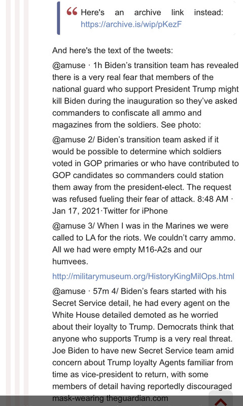 That or they are going to arrest President Trump before he leaves DC. That would cause the riot of all riots and they would need an army. Can they do that? This is getting weird and somewhat scary. There are some very demented and demonic democrats (Pelosi) and it is being kept very quiet.