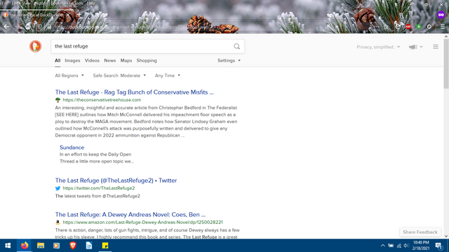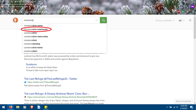 This paragraph piqued my interest: We are aware the eye of sauron, ie Google, has already targeted CTH 2.0 to eliminate traffic and site visits. However, fortunately for us we have a long history of readership and only around 7 percent of total traffic was dependent on Google as a search value. So I ran some tests on DDG. My results: