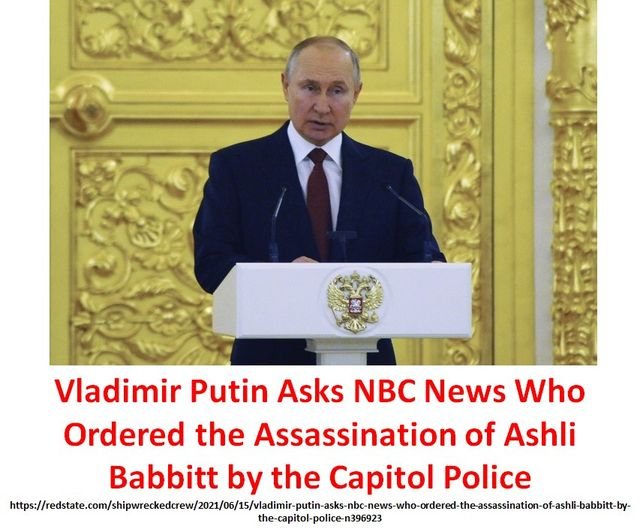 Vladimir Putin Asks NBC News Who Ordered the Assassination of Ashli Babbitt by the Capitol Police https://redstate.com/shipwreckedcrew/2021/06/15/vladimir-putin-asks-nbc-news-who-ordered-the-assassination-of-ashli-babbitt-by-the-capitol-police-n396923