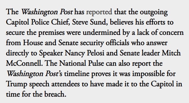 The Washington Post has reported that the outgoing Capitol Police Chief, Steve Sund, believes his efforts to secure the premises were undermined by a lack of concern from House and Senate security officials who answer directly to Speaker Nancy Pelosi and Senate leader Mitch McConnell. The National Pulse can also report the Washington Post’s timeline proves it was impossible for Trump speech attendees to have made it to the Capitol in time for the breach