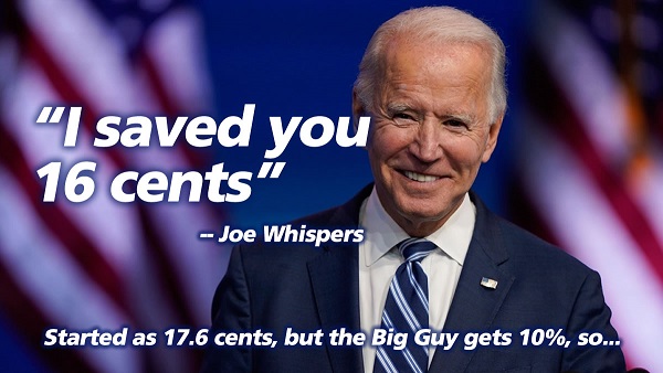I texted a liberal acquaintance on the day Trump left office that the gas price at my station in Burbank, CA was $3.25/gallon. Told her to write that down. Today it was at $4.49/gallon.