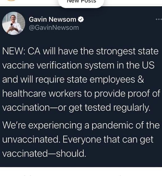 California Gov. Newssolini has jumped onboard with NYC Mayor Dummkoph DeBlasio to require proof of the non-vax from State of CA employees, or regulary testing.