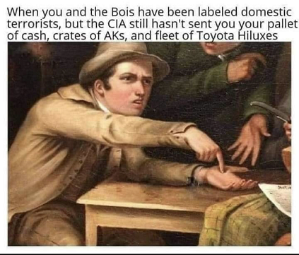 “Oath Keepers” are also in the list. Imagine that. People who made and oath to defend the constitution against all enemies, foreign and domestic, are targets of “the government.”