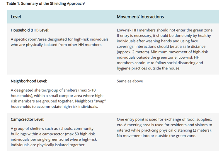 A summary of the shielding approach described by Favas is shown in Table 1. See Guidance for the prevention of COVID-19 infections among high-risk individuals in low-resource, displaced and camp and camp-like settings 1,2 for full details.