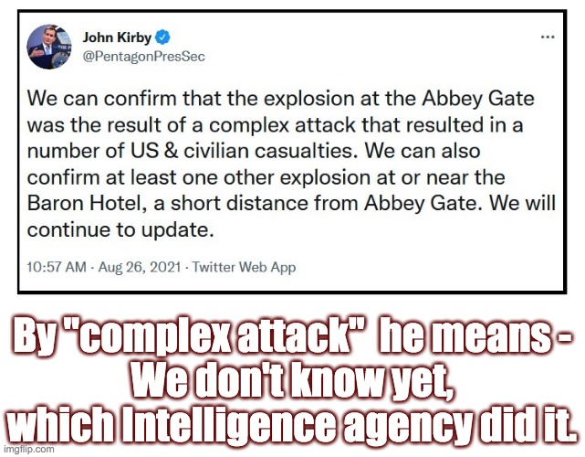 1) If the Dems really think/believe that they are going to “get away” w/ 2020 Voter Fraud>>>> they did it so we would have to STAY in Afghanistan. They never wanted to pull out in Aug. to begin with and now they’re looking for excuses to stay. Today they got one.