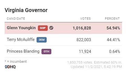 Zerohedge.com post shows Decision Desk has called Virginia for Youngkin w 1,016,828 votes to Mc 822,003. Youngkin has 10.5pt lead…