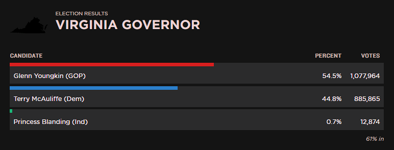 61% precincts reporting—thus far Terry McAuliffe getting his posterior handed to him by Youngkin…..
