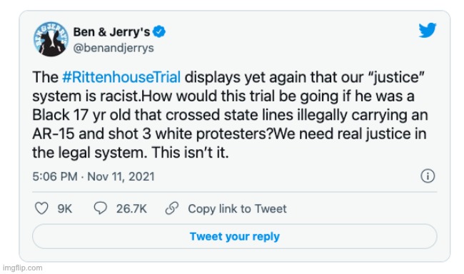 There is an element of truth to this post from Ben and Jerry: If it had been a black 17 year old who was defending himself, he wouldn’t have been charged, guaranteed.