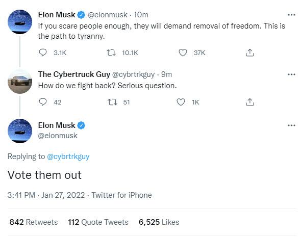 in answer to a question “how do we fight back?” musk replied, “vote them out.”