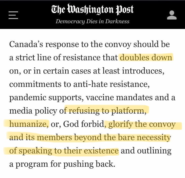 Washington Post, David Moscrop (Contributing columnist) calls Canada’s Freedom Trucker Convoy toxic and in vile language calls for them to be shut down and destroyed.