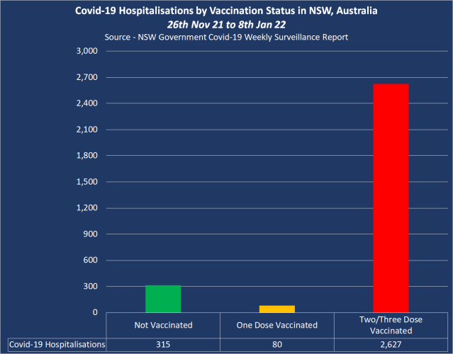 The number of hospitalizations appear under each bar: 315 unvaxxed; 80 single dose; and, 2,627 two and three doses