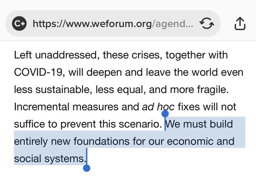 “The world must act jointly and swiftly to revamp all aspects of our societies and economies, from education to social contracts and working conditions. We must build entirely new foundations for our economic and social systems” — Klaus Schwab, ‘Now is the Time for a Great Reset,’ 2020