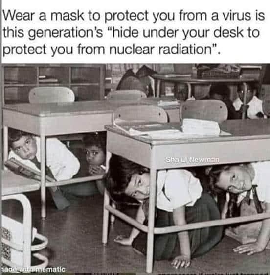 Much better than masks as I remember. We got to line up in the halls against lockers, arms protecting our heads. Was fun like a fire drill. I enjoyed the activity. Would not have enjoyed being ‘restricted’ as our babies have been with these masks.