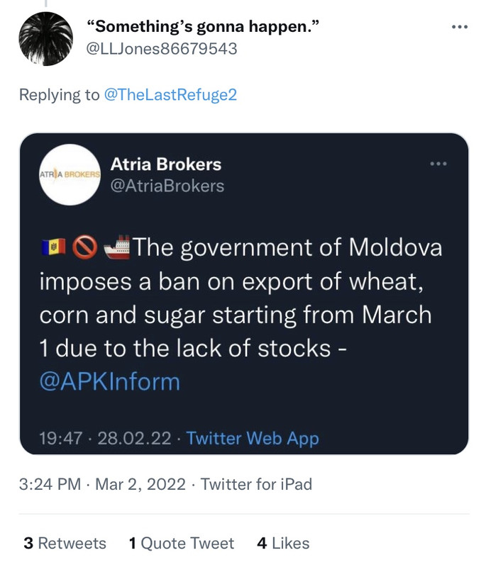 All I know is when there is a world wide food shortage I want President Trump to be in office in the White House! That vegetable, dolt, village idiot ChiCom Joe will just cave to Xi Jinping! God help us! Hosanna!