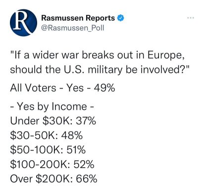 All according to their plan, of course. Get ready for a prominent R to have a really bad racial take or have a zipper issue be blown up in the next few months and have it be hammered into the public up until November. Also every Republican candidate running for Congress will be put to the litmus test of for or against Ukraine.