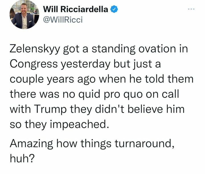Zelenskyy got a standing ovation in Congress yesterday but just a couple years ago when he told them there was no quid pro quo on call with Trump they didn’t believe him so they impeached.