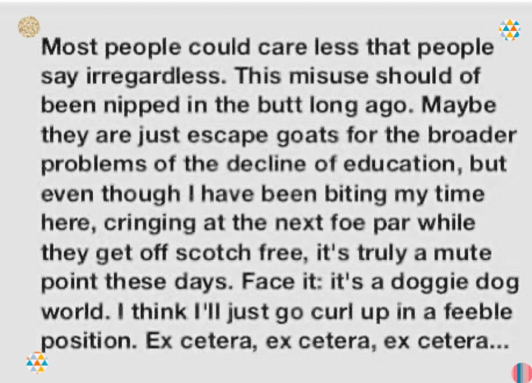 Most people couldn’t care less that people say ‘irregardless.’ This misuse should have been nipped in the bud long ago. Maybe they are just scapegoats for the broader problems . . .biding my time … faux pas . . . scot free … moot point … dog eat dog . . . fetal position . . . et cetera.