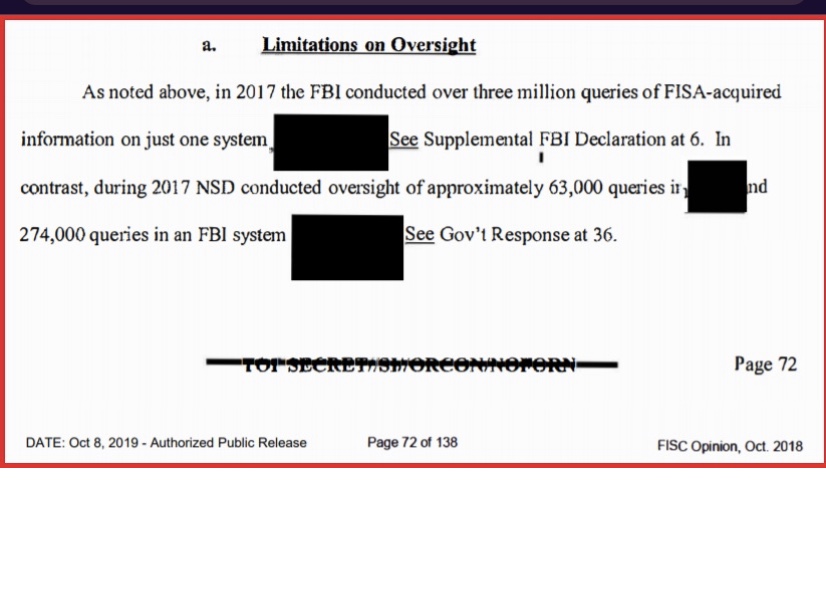 There were tens-of-thousands of unauthorized search queries; and as Judge Collyer stated in her report, there is no reason to believe the 85% non compliant rate was any different from the abuse of the NSA database going back to 2012, the same year the FBI collocated a workspace within Perkins Coie.