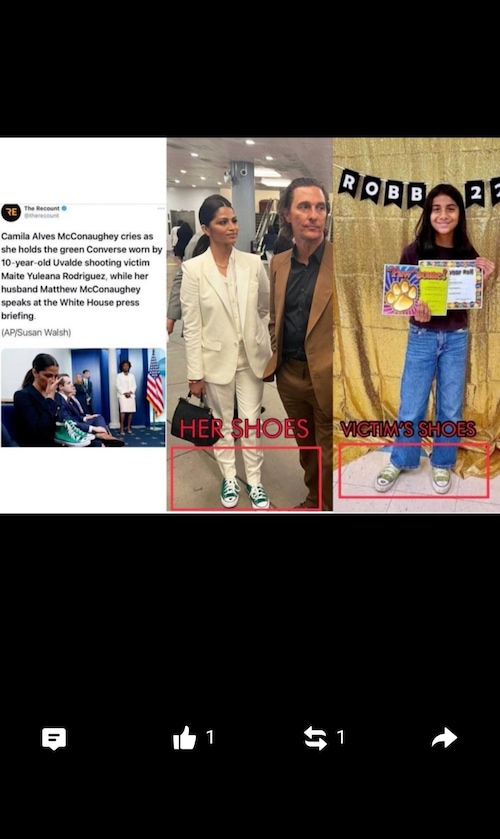 Is there more to this story? The picture of Maite may not be a picture of her on the day she was shot? Some people own more than one pair of shoes. Maybe she got new shoes? If Maite’s family is receiving public assistance for being a recent “immigrant”, than they are doing WAAAYYY better than I am and I own a lot of shoes. Is Camila wearing green Converse sneakers to honor Maite?