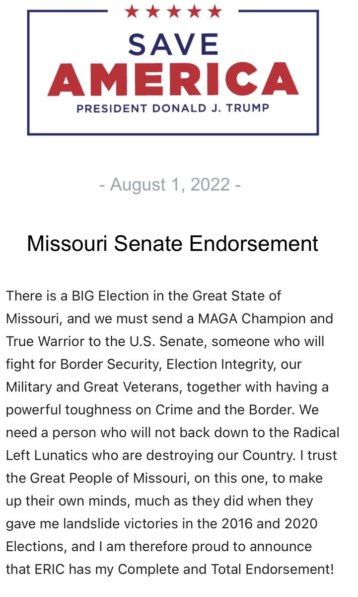 He endorsed ERIC! LOL! Says need a MAGA candidate and will let the people of MO pick one. Apparently happy with either.