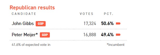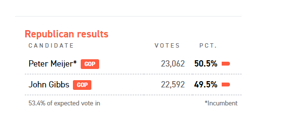 Gibbs pulled ahead a little bit. It looks like the traitors in Washington aren’t going to be primaried but hopefully the one in MI-03 will be.