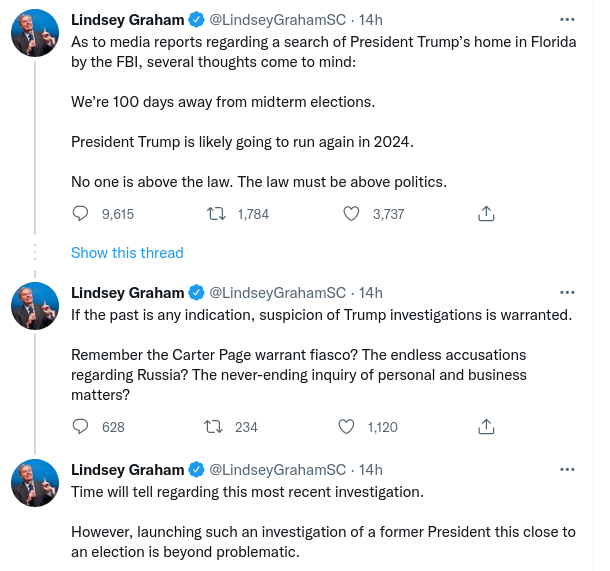 .@SenatorTimScott says the American public needs to let the FBI’s search and DOJ investigation of former Pres. Trump “play out” before jumping to conclusions — adding that this could raise more questions about whether the agency is “doing their job apolitical.”