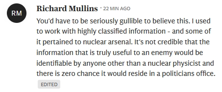 Indeed. I also read that the National Archives, the department supposedly involved, would not be involved in anything nuclear. Their lies make no sense. That’s kind of required for successful lying 101. Come on guys, do better! \s