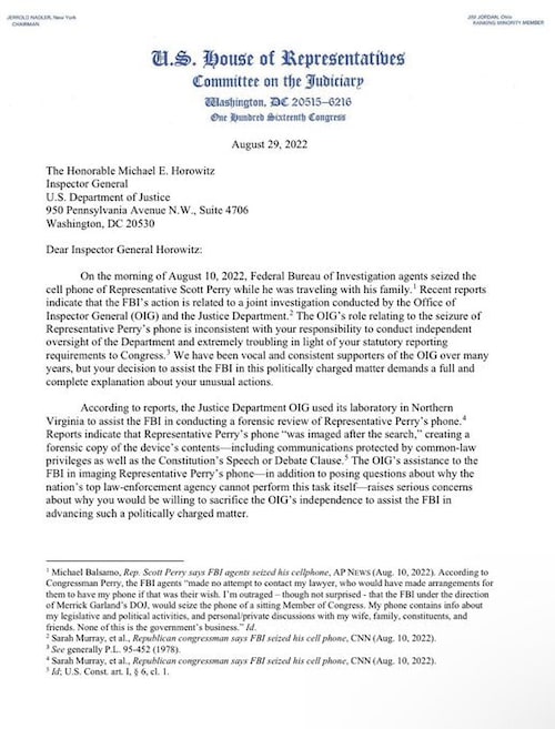 @Jim_Jordan just sent a letter to Department of Justice Inspector General Michael Horowitz requesting details on the OIG’s unusual decision to assist the FBI with the unprecedented seizure of U.S. Representative Scott Perry’s personal cell phone.