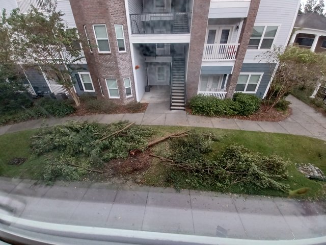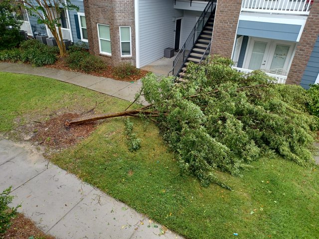 North Charleston, SC. My family and our apartment complex were really lucky – the worst damage was a young elm that came down right in front of our apartment. I did see a few shingles on the ground when we went out and walked around, so hopefully someone will check the roofs.