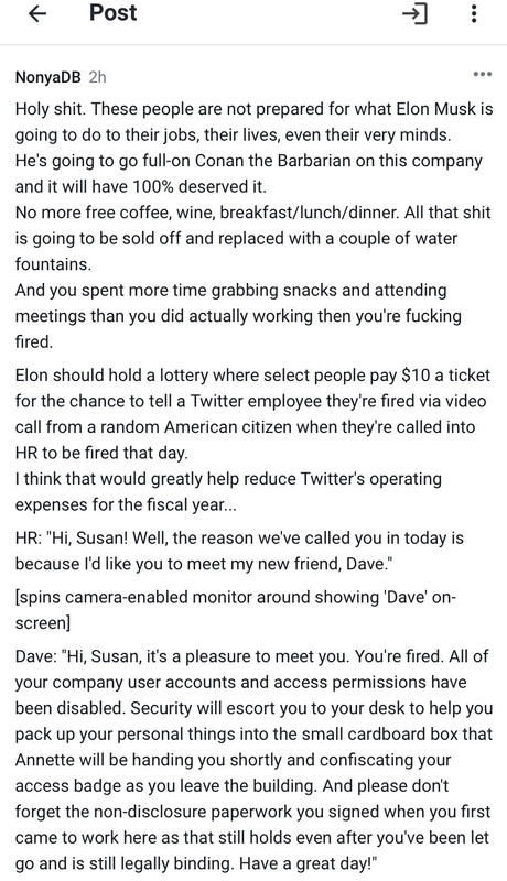 Elon will start his Friday speech with “Ya all are fired. We are moving HQ to Texas where Employees and contractors don’t make demands because its a “right to work state” Googled it morons, now go!”