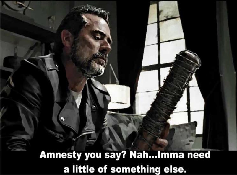 Any talk of possible amnesty comes long after those sequential issues are resolved. But considering, well, hell, they haven’t even stopped the madness yet, they have some nerve asking for amnesty.