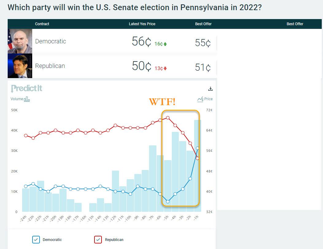 Check out this graphic on ZeroHedge: within hours a massive spike for Futterman accompanied by a massive drop for Oz in Pennsylvania on a political betting site: