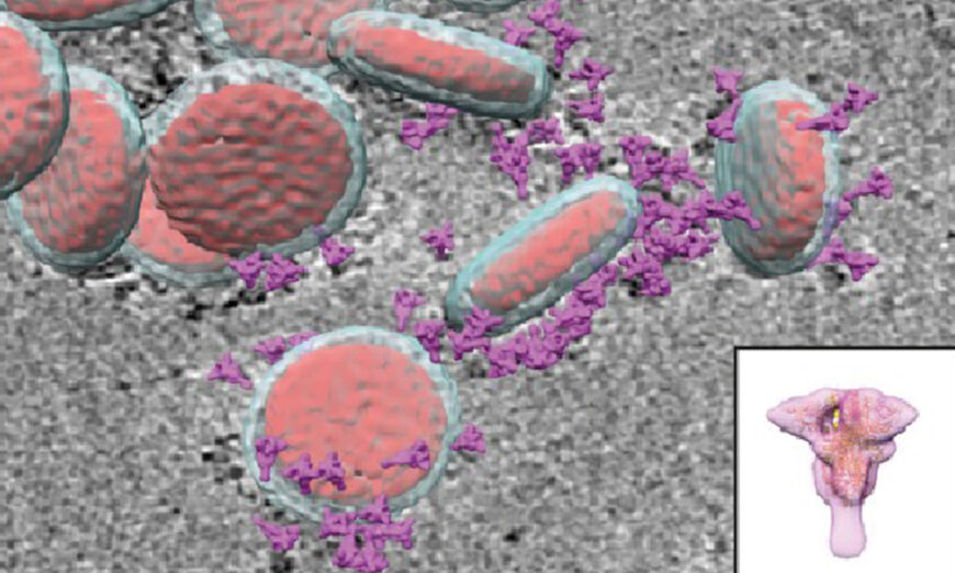 Tomogram section of Wuhan virions in cross-section showing surface spike proteins (purple) surrounding the viral membrane (pale blue) and the nucleocapsid (red) in the virus interior.