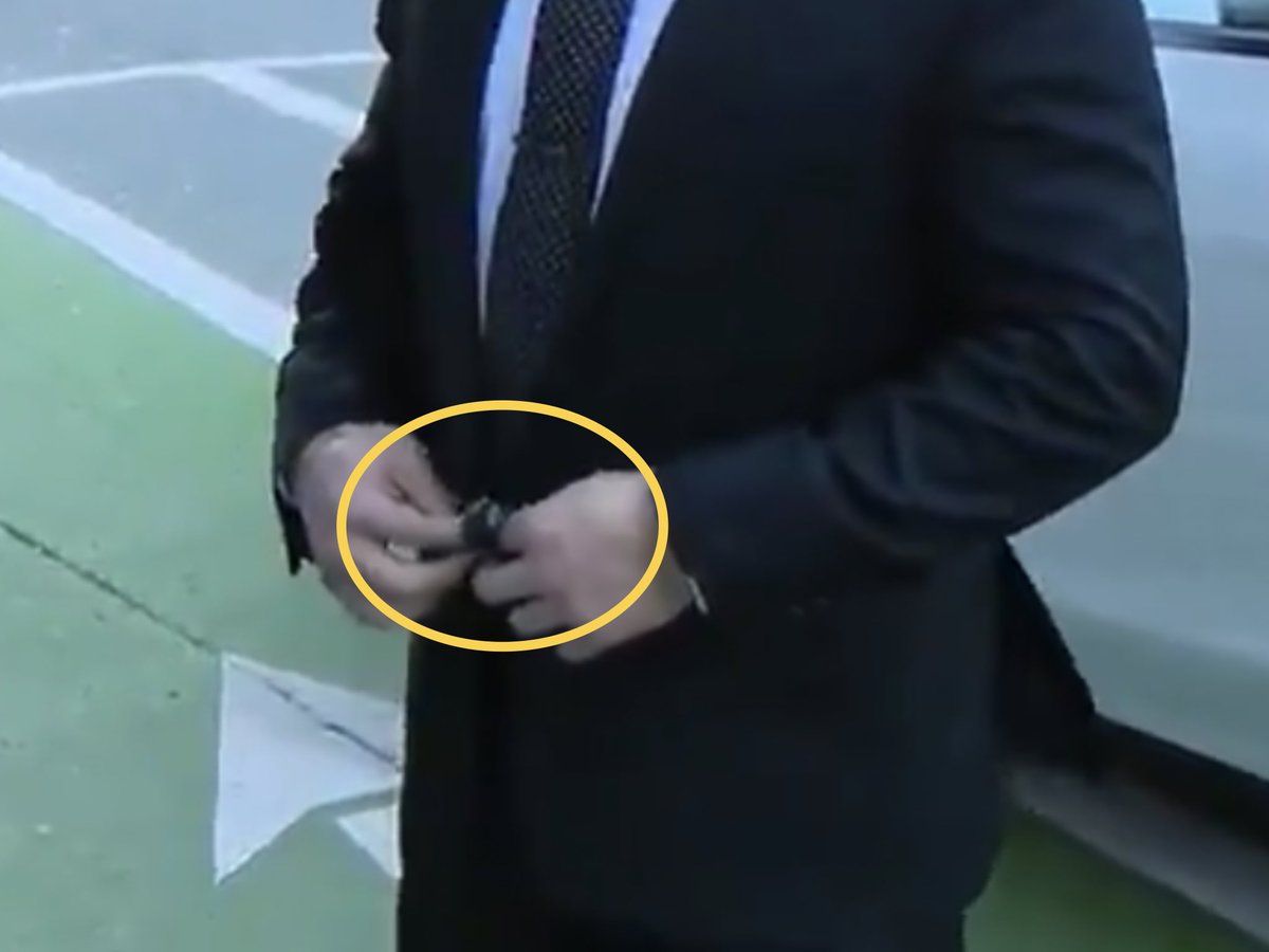 He makes a movement as if he were going to button his jacket but in reality he presses the ring discreetly