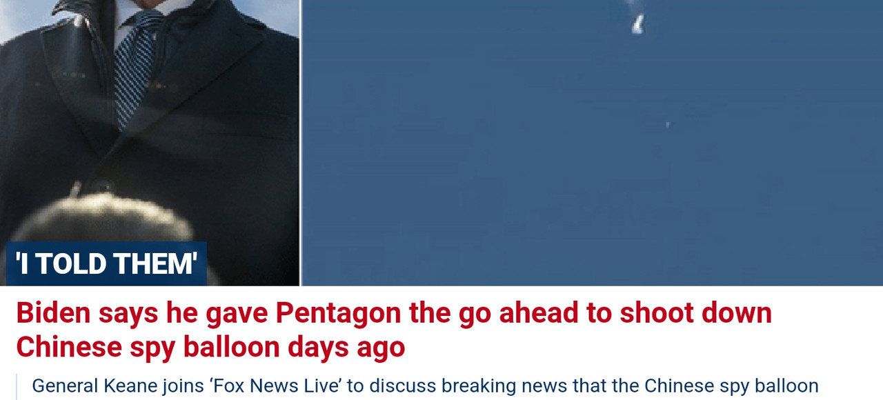 Either way doesn’t matter to me, biden gives permission to destroy on Feb 1. I read elsewhere the balloon breached US airspace on January 28th. So, it took the braintrust 4 days to determine the balloon must be eliminated?