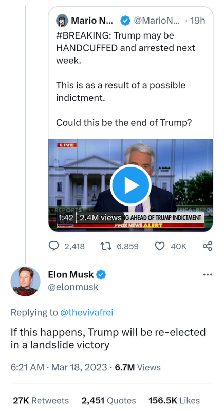 After digesting it a little more DT won’t give DeSantis a chance. He will turn himself in right in front of the cameras. He will get a huge bump in his favorability rating as well. I can’t believe they would be stupid enough to go through with it but let’s face it these people are not geniuses. This will make Trump a sympathetic character in the eyes of many. Its important to always measure the zeitgeist and I have a suspicion arresting DT on some flim flam charges is no longer a priority when you can’t afford your groceries. If this were to have happened in 2021 complete different ballgame. Now with all of the anti war Dems signing blank checks to Ukraine risking all of our lives suddenly Orange Man not so bad.
