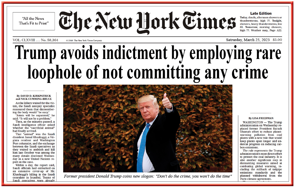 “President Trump avoids indictment by employing rare loophole of not committing any crime.” aka “Don’t do the crime, you won’t do the time”