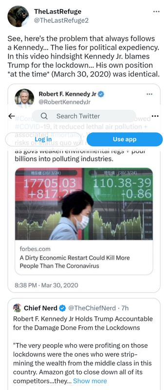 So my take on RFK Jr’s tweet is that, if given the chance, he would be in favor of lockdowns not only for diseases but for “pollution” reduction. He fits right in with the Green New Deal.
