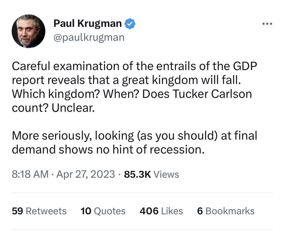 Have no comment on this report. Need to see GO(Gross output) number for the March quarter to make any useful conclusion about the Economy. Business to Business spending accounts for 60% of economy. The 4th Quarter 2022 GO was approximately 1%. When that number was reported we knew 1st quarter 2023 GDP would be very weak. With debt at current levels, government spending has a negative impact on the private sector. Expect that most of these malinvestments will be written off over time.