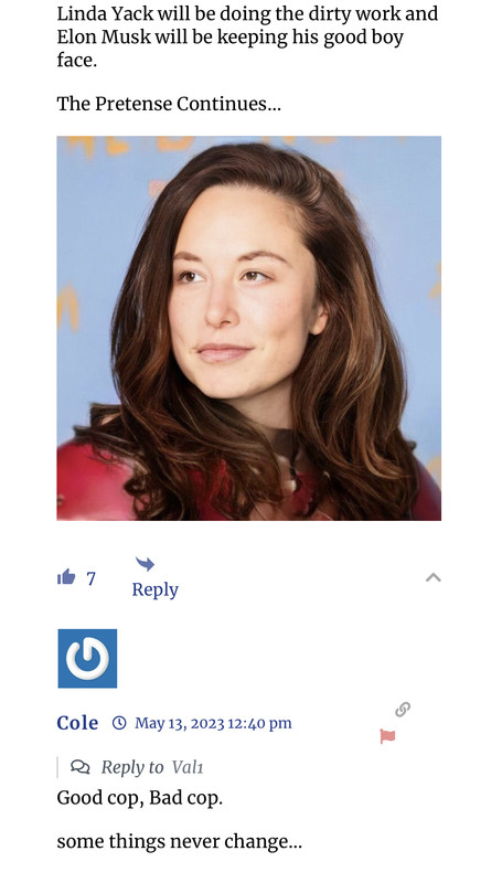 (Sigh) Maybe Musk can’t fire her… and she knows it. Maybe he isn’t the one who wanted her hired?