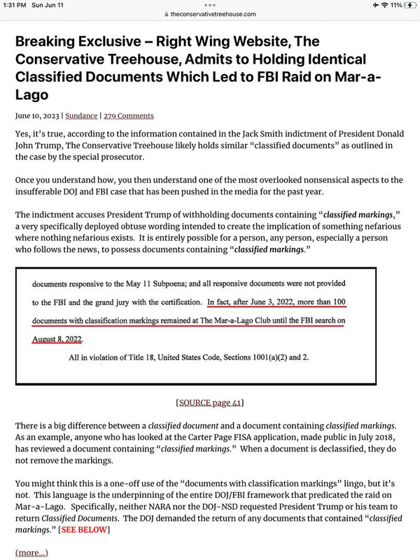 The indictment accuses President Trump of withholding documents containing “classified markings,” a very specifically deployed obtuse wording intended to create the implication of something nefarious where nothing nefarious exists. It is entirely possible for a person, any person, especially a person who follows the news, to possess documents containing “classified markings.”
