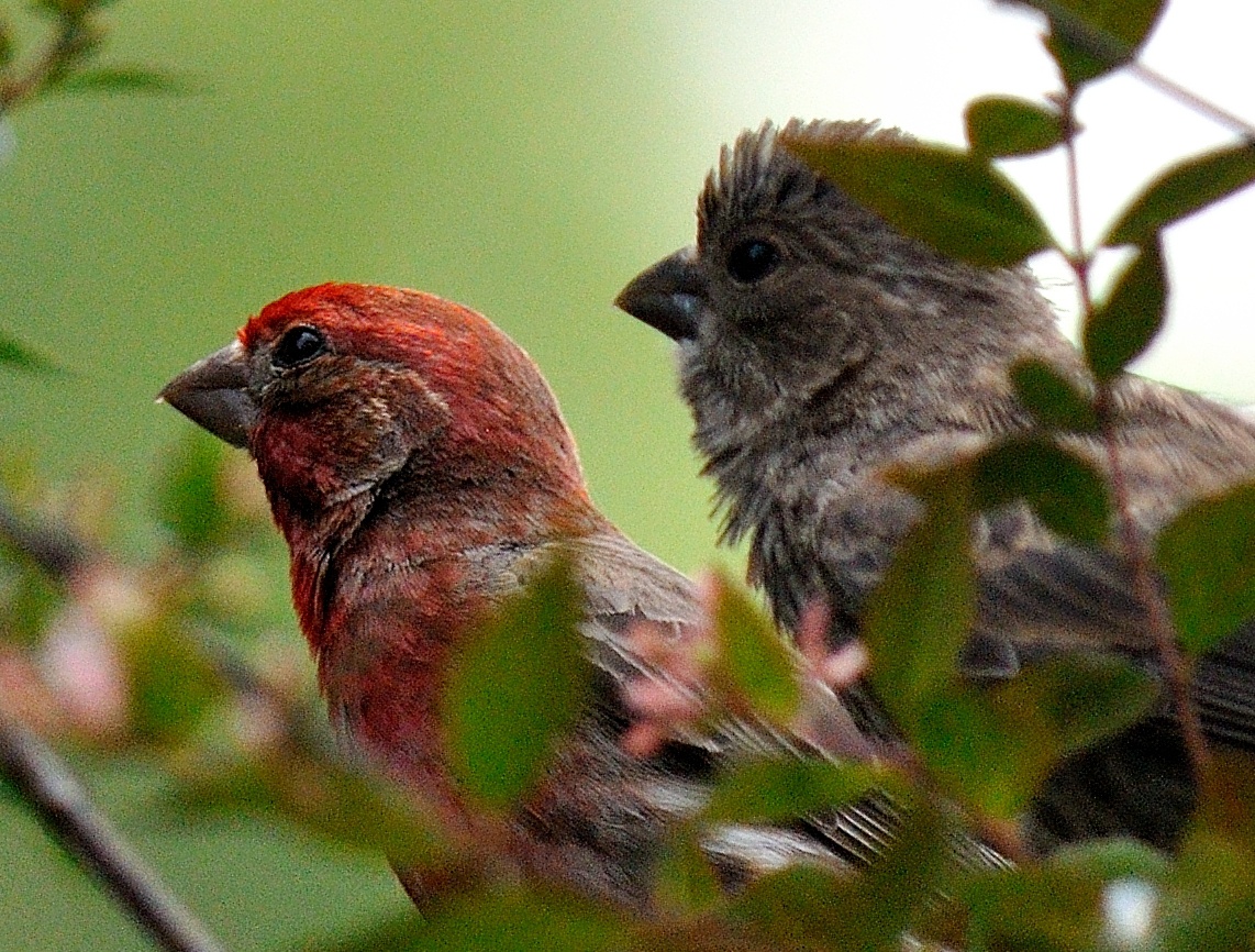 House Finches. They are regulars in my yard. I haven’t found where they nest yet, but they do like lamps posts and hanging lamps. Very unafraid of us Humans and like to nest near us. Ty Bet