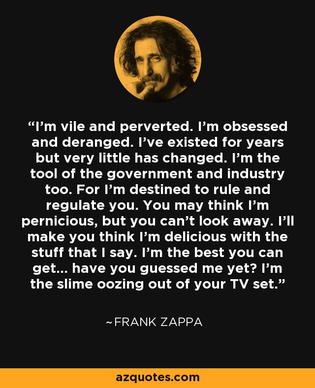 Zappa was very eccentric with his music and in some ways vulgar. He was also very intelligent and knew things about the 60’s revolution in music that we don’t talk about. I have mixed feelings about him, but I cannot dispute that he was intelligent and was trying to warn us.